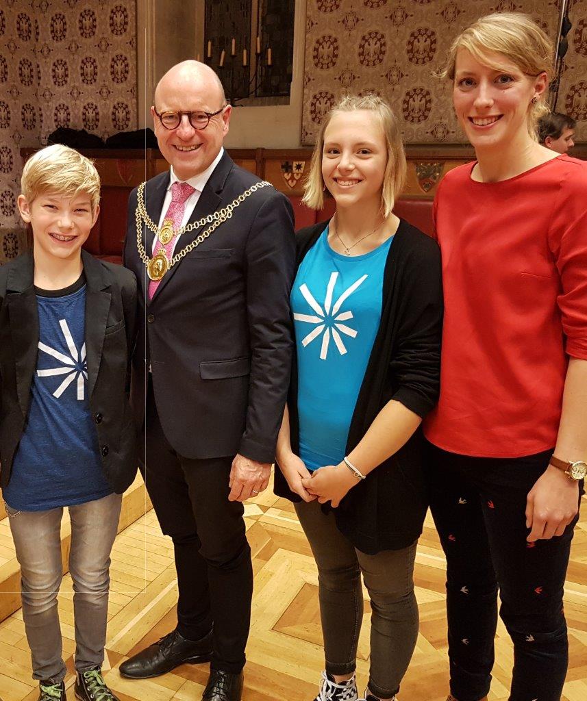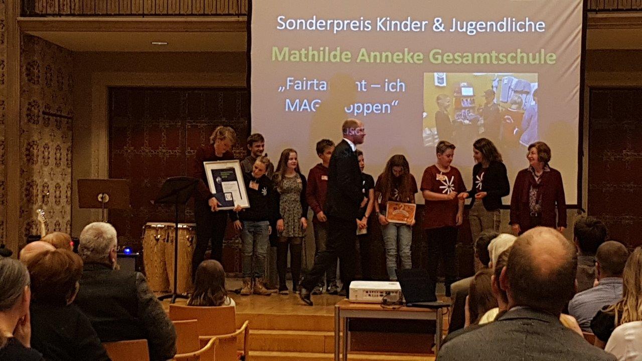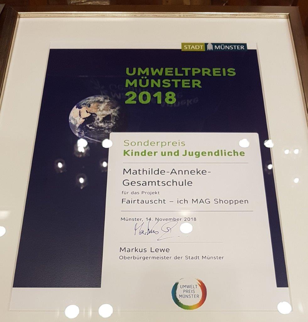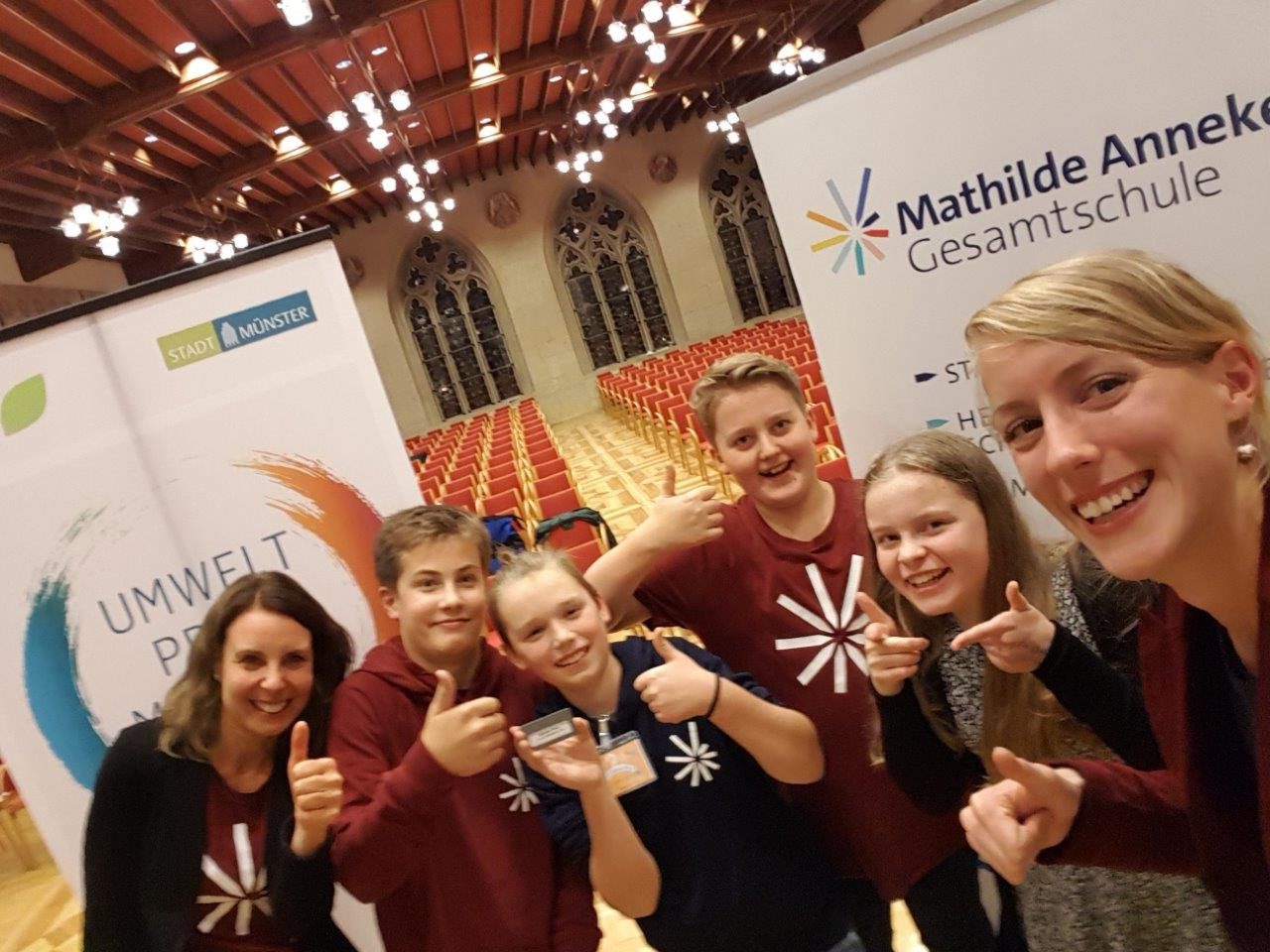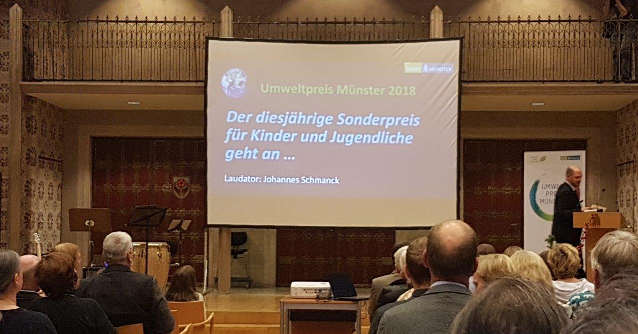 Ein sehr aufregender Abend im Rathausfestsaal der Stadt Münster liegt hinter uns! Alle Bewerberinnen und Bewerber um den Umweltpreis der Stadt Münster waren am Mittwoch, den 14. November eingeladen, an der feierlichen Preisverleihung des diesjährigen Umweltpreises der Stadt teilzunehmen. Nach einer sehr spannenden Laudatio hatten wir die Gewissheit: Gewinner des Umweltpreises 2018 in der Kategorie Kinder und Jugendliche ist unser Projekt „Fairtauscht – Ich MAG Shoppen“! Gemeinsam mit den Schülerinnen und Schülern der Projektgruppe haben wir die Urkunde und das Preisgeld in Höhe von 500 Euro auf der Bühne entgegengenommen sowie glücklich und souverän alle Fragen der Moderatorin zum Projekt vor dem Publikum im voll besetzten Rathausfestsaal beantwortet. Wir freuen uns sehr über den Preis und bedanken uns an dieser Stelle bei allen Unterstützerinnen und Unterstützern, die dazu beigetragen haben, dass wir dieses tolle Projekt realisieren konnten und nun erfolgreich durchstarten!