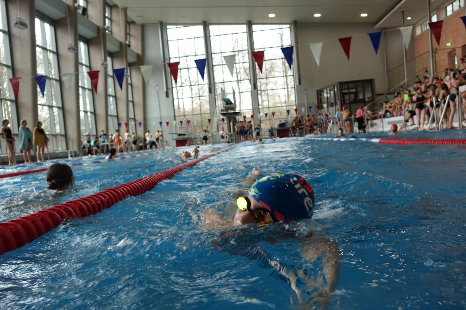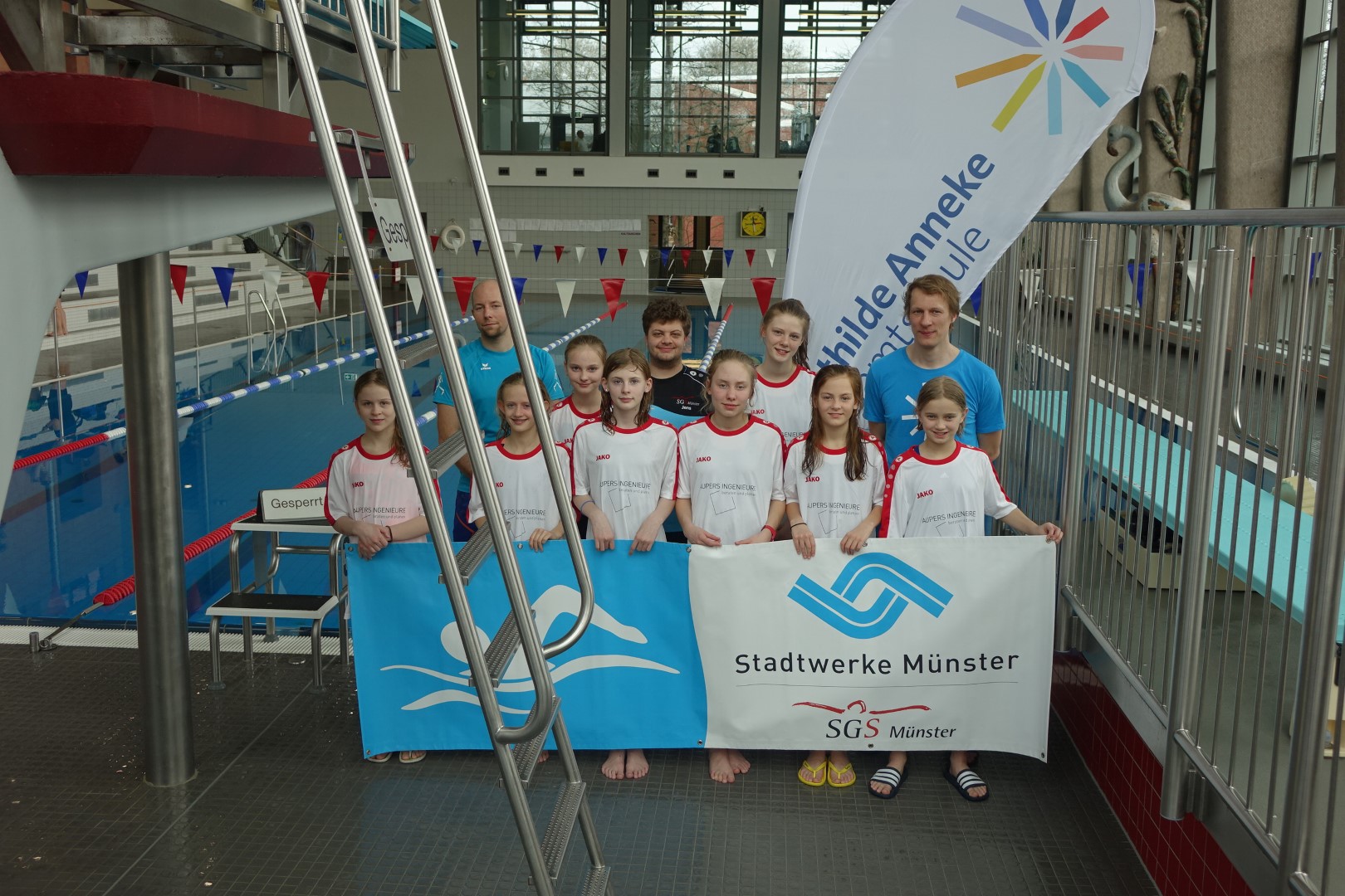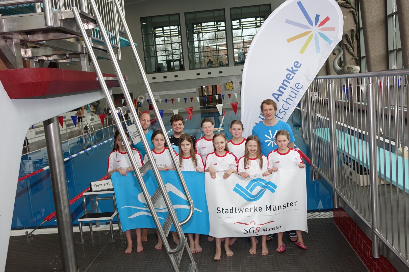 Am Donnerstag,21.02.2018 fanden im Stadtbad Mitte die Stadtmeisterschaften im Schwimmen des Landessportfestes der Schulen statt. Dieses Jahr nahm die Mathilde Anneke Gesamtschule erstmals mit zwei WKIII Mannschaften und – wie in den letzten zwei Jahren auch – mit zwei WKIV Mannschaften teil. Begleitet wurden sie von den Sportlehrern Herrn Sodies und Herrn Müller.