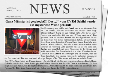 Bei unserer ausgedachten Krimi-Geschichte wurde das „J“ vom CVJM-Schild in der Nacht geklaut! Die Mitarbeitenden sind ratlos: Wer könnte wohl der/die Täter:in sein? Auf dem Gelände des Johannes-Busch-Hauses (Merschkamp 23) sind spannenden und kniffeligen Rätsel versteckt, dessen Hinweise euch zum/zur Täter:in führen. So können wir gemeinsam herausfinden, wer den Buchstaben gestohlen hat. Wenn ihr am Johannes-Busch-Haus am Hallen-Eingang steht, findet ihr einen Brief, der euch vielleicht schon einige Hinweise zum/zur Täter*in liefert. Schlüpft in eine Rolle als Detektiv:in und vielleicht findet ihr heraus, wer es war, und helft uns, unser „J“ wiederbekommen. Falls ihr mal nicht weiterkommt, findet ihr sicher auch Mitarbeiter:innen auf dem Gelände, die euch vielleicht einige Tipps geben können.