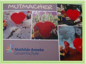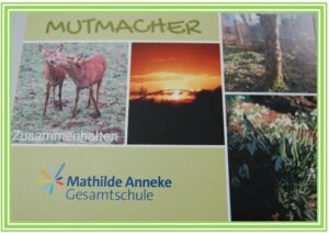 Die Schüler:innen wurden ermuntert, uns ihre „Mutmacher“ als Fotos zu senden und aus diesen Fotocollagen als Postkarten zu kreieren. Mit ganz persönlichen Mutmach-Worten erreichten diese Postkarten unsere Kooperationspartner, Freunde, Familien, Nachbarn. Besonders die Bewohner:innen des Klarastifts freuen sich über die Mut machenden Worte der Jugendlichen und hoffen, im nächsten Schuljahr wieder persönlich mit unseren Schüler:innen in Kontakt zu treten, denn davon lebt das soziale Engagement.