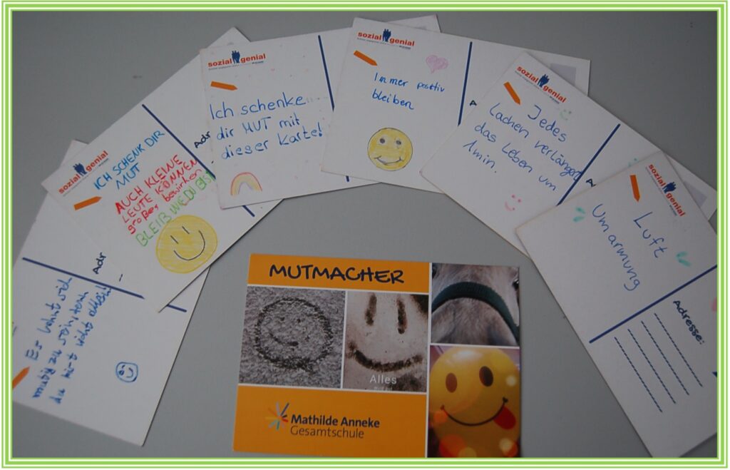 Bereits im März gestalteten die Schüler:innen des 7. Jahrgangs „Mutmacher-Postkarten“, damit der Gedanke des Projektes „Sozial?Genial!“ auch während des Distanzunterrichts lebendig bleibt: „Was kann ich gut, was anderen nützt?“