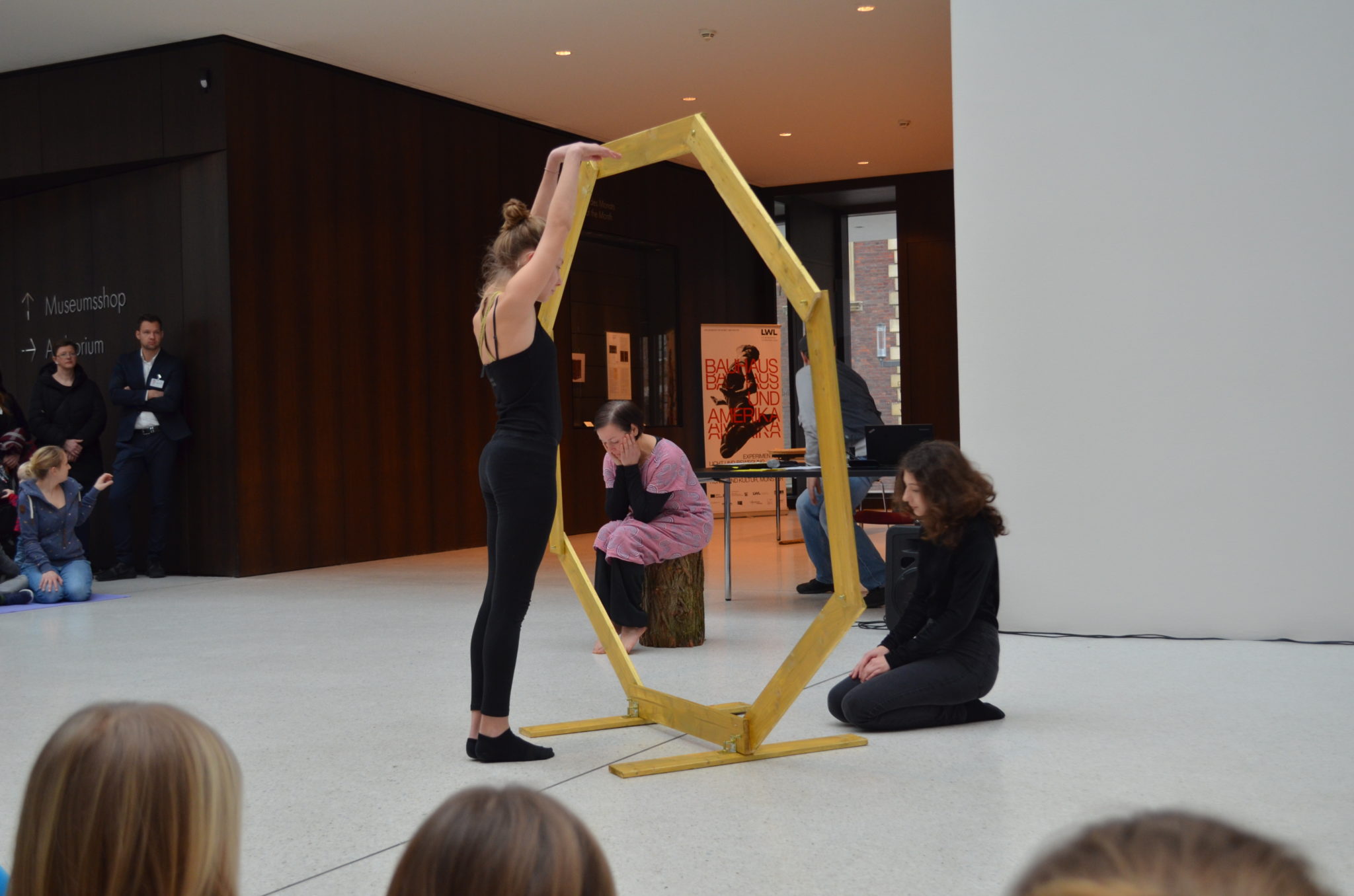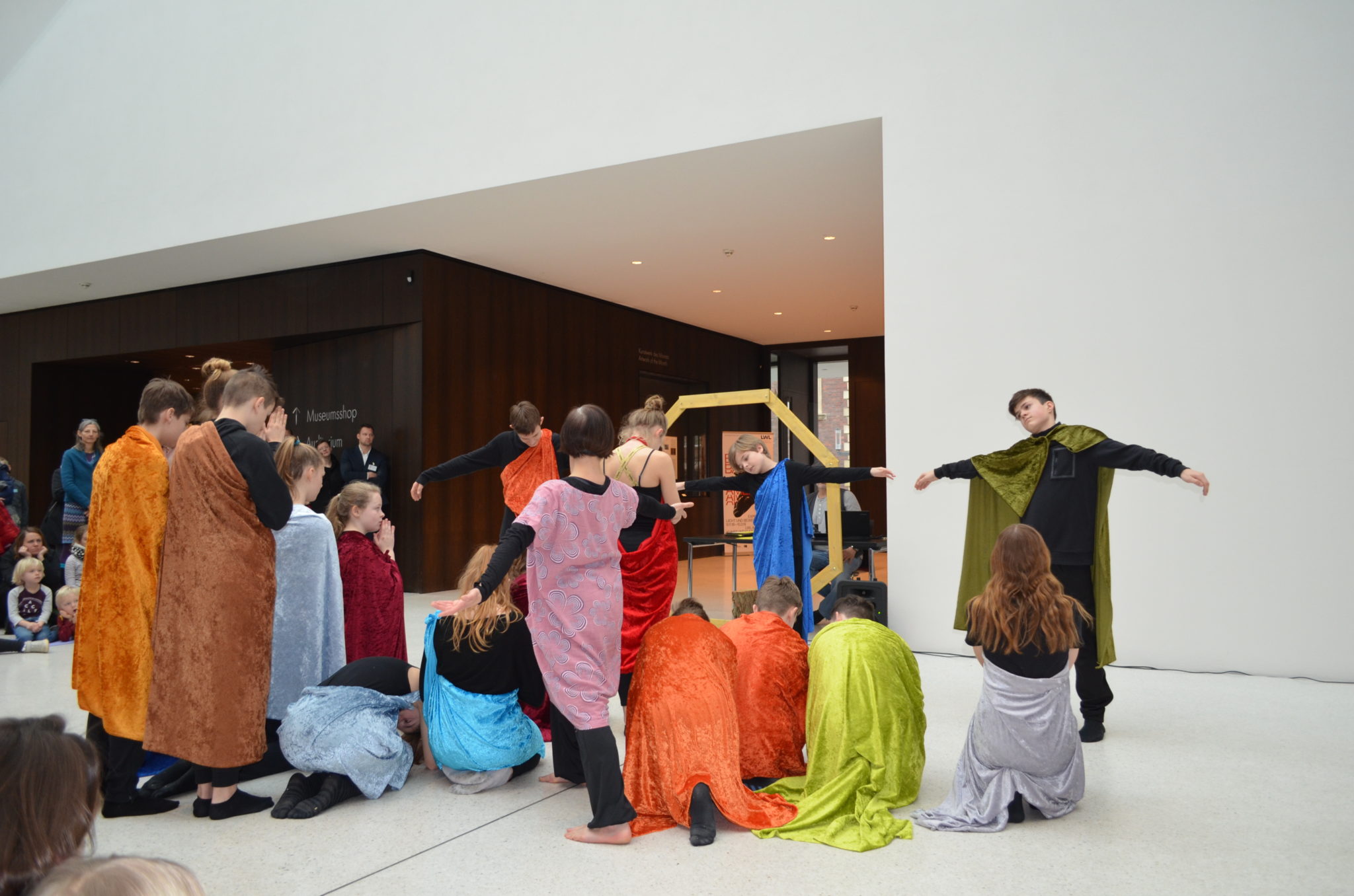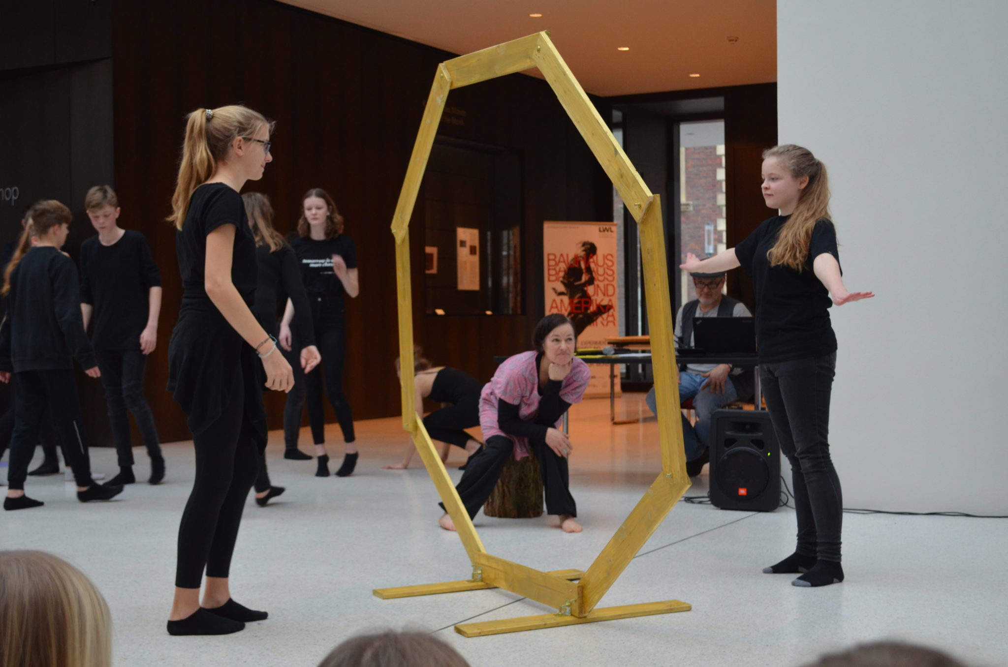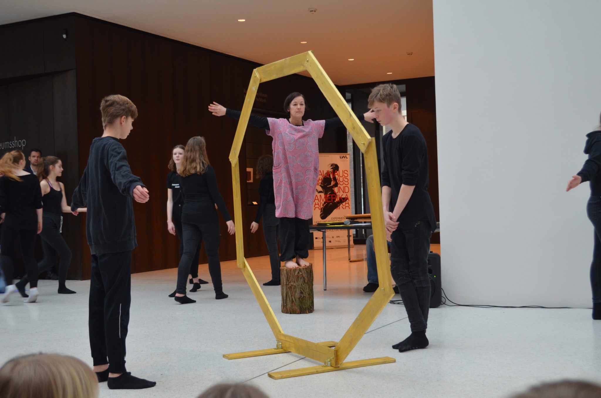 Am Sonntag (10.02.2019) zeigte der Kurs Darstellen und Gestalten des siebten Jahrgangs unter der Leitung von Jenni Bürger seine Tanzperformance im Rahmen des Familientages des LWL-Museums für Kunst und Kultur. Die Schülerinnen und Schüler hatten mit den Tanzpädagoginnen des LWL-Museums Ruth und Ulli Trautmann im Unterricht eine Performance entwickelt, die sich auf das Kunstwerk „Tracht und Bleiche“ (Comicaltar) der Künstlerin Anke Feuchtenberger bezieht. Die  Schülerinnen und Schüler beeindruckten mit Tanz, Schauspiel und selbstgeschriebenen Texten zu dem Kunstwerk und weckten so die Neugier der kleinen und großen Besucher auf die Ausstellung im Museum.